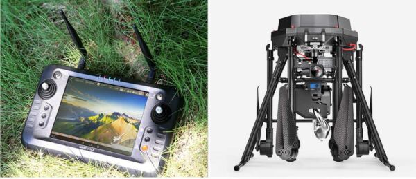 - Radio-control system with integrated ground contol. All-in-one transmitter system includes a big LCD screen for real time video from the drone and groind control software.